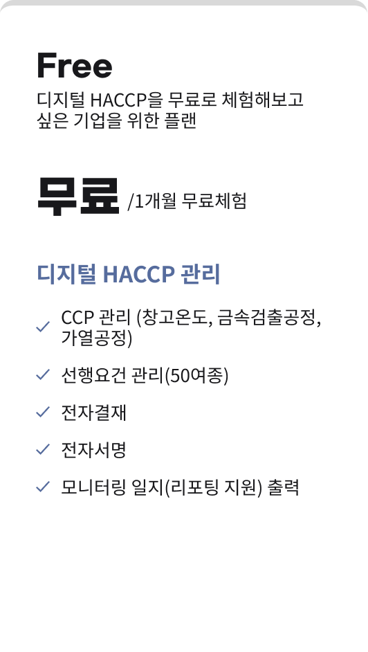 고객 정보 관리 (스마트HACCP 기술지원 업체 관리) | 「식품위생법 제48조」,「축산물 위생관리법」제9조 및 제44조,「한국식품안전관리인증원의 설립 및 운영에 관한 법률」제6조 | (필수) 법인명, 성명, 주소, 연락처, 이메일, ID, PW(첫 발급 시) | 10년 |